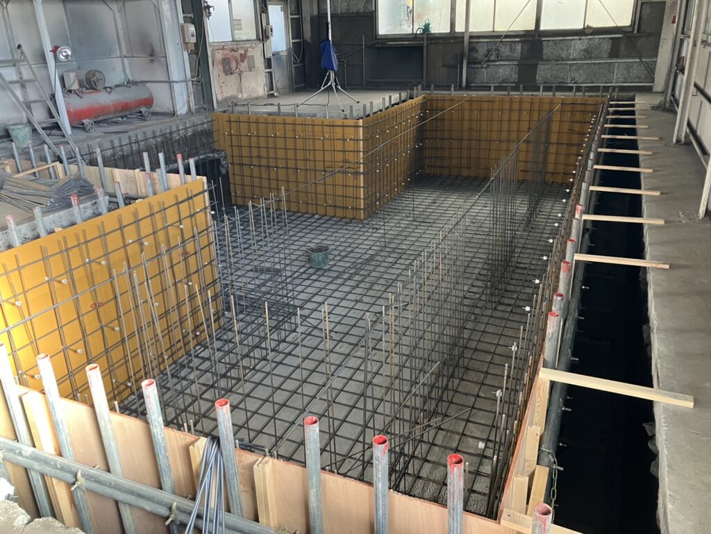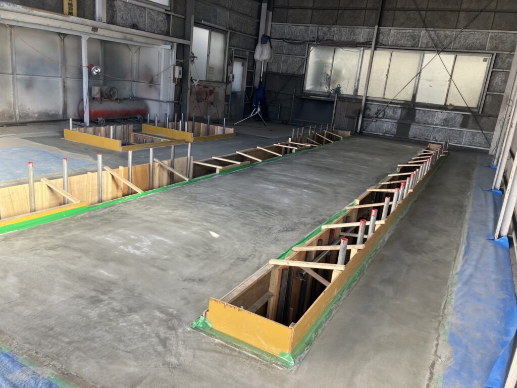 次に、プッシュプル式の塗装ブースを設置するため、鉄筋をたくさん入れてしっかりした基礎作りです。これで大型車両が入っても安心です!